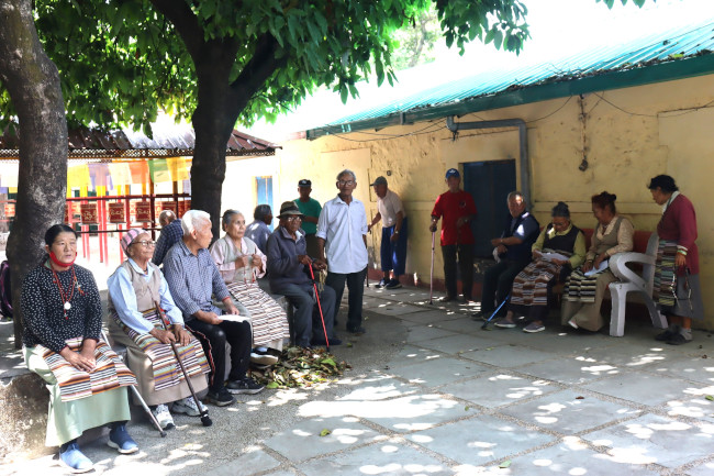 An einem sonnigen Tag im Mai im Innenhof des Seniorenheims Rajpur.